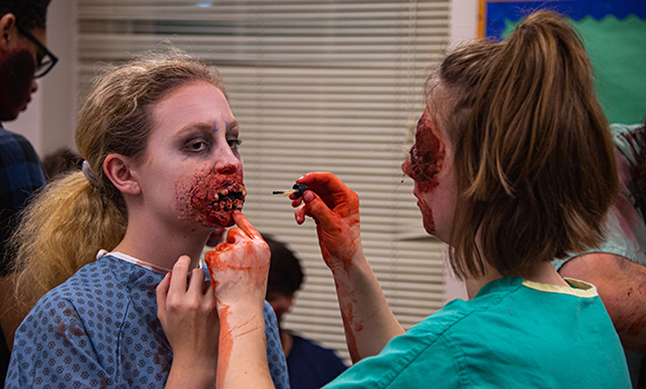 student dressed as zombie nurse putting fake blood on another student dressed as a zombie nurse