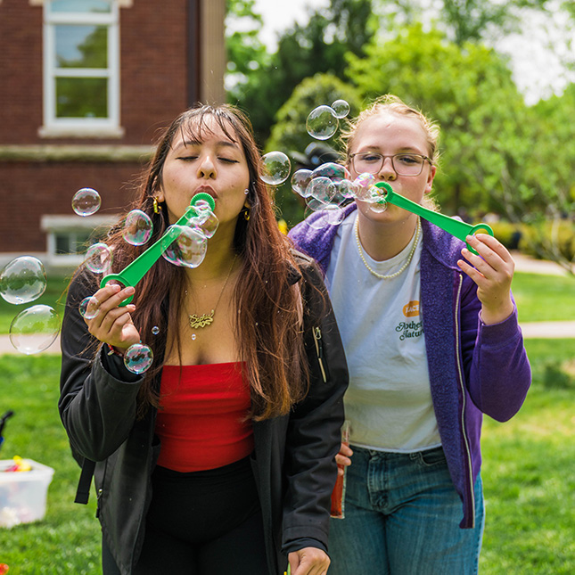 Bubbles floated by the Astera sculpture from a grassy area where students ate popsicles and played lawn games.