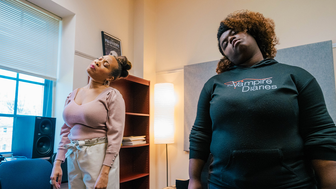 As Visiting Assistant Professor of Voice Janinah Burnett teaches a lesson with a first-year vocal performance major, it almost looks like a workout routine. She takes her student not just through a vocal warmup, but a physical warmup as well.