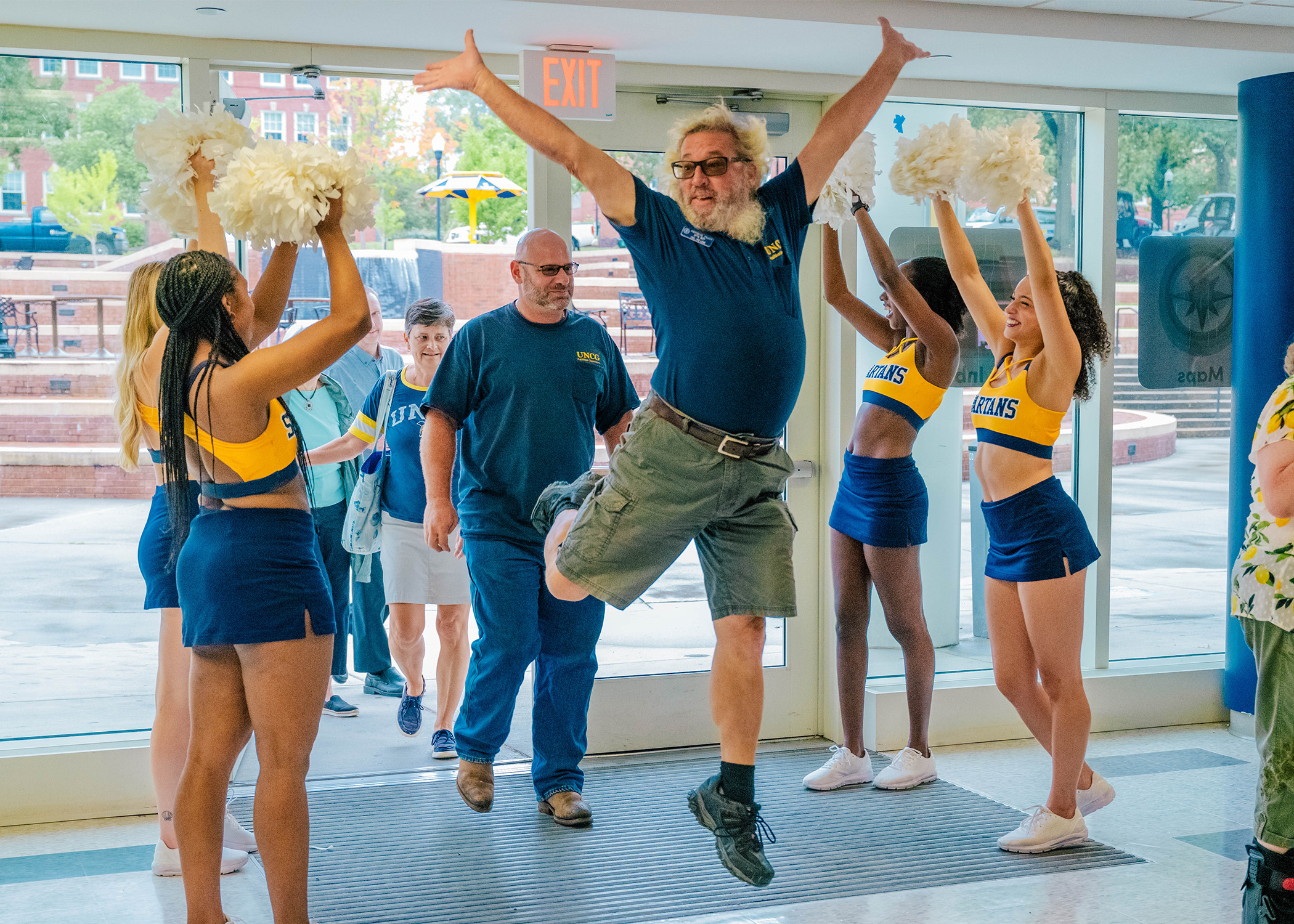 There, fans are hyped up by the cheer and dance teams, the pep band, and of course, the skills of our student-athletes, but they’re most excited to follow the lead of the face of our athletic program – Spiro!