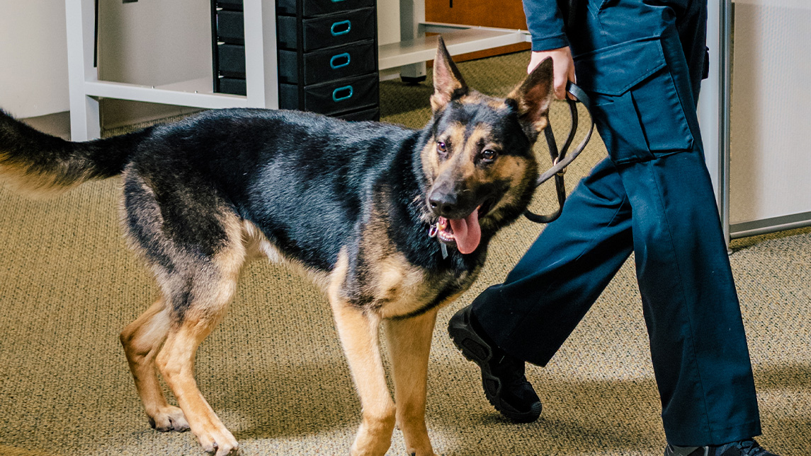 At two years old, Felix can help with searches, whether it be sniffing out an item someone might try to hide in a criminal act, or helping a student find an item they misplaced. He can also help track down people and is trained to find narcotics.