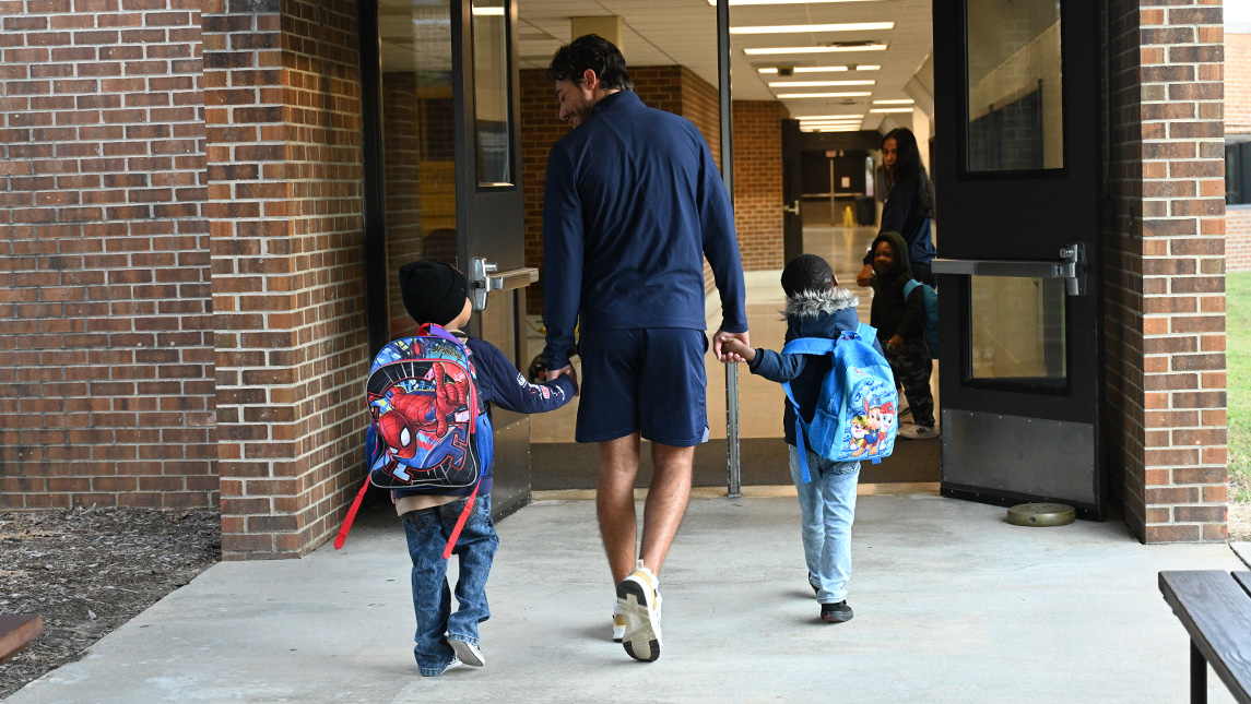 On Mondays, Wednesdays, and Fridays at Gateway Education Center in Greensboro, you will see a lot of blue and gold at the yellow school bus. As students enter for the school day, UNC Greensboro Spartans are helping them get started.