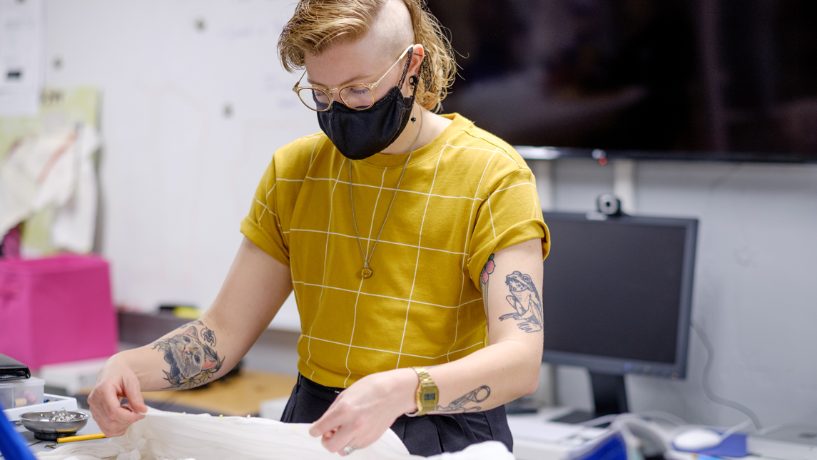 Kitch’s major, the Bachelor of Fine Arts in Drama – Design and Technical Production, educates students to be literate in the history, theory, and practice of theater, and to have particular training in designing for the stage and stage technology. And in Kitch’s case, you can add to that list of outcomes being able to pivot on your creative heels during a pandemic.