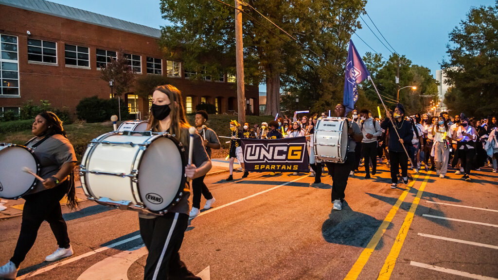 You could feel the Spartan spirit as a blue and gold wave of students, faculty, and staff made their way from the UNCG Baseball Stadium to the Greensboro Coliseum during UNC Greensboro’s third annual “Storm the Streets” spirit march on Tuesday, Nov. 9.