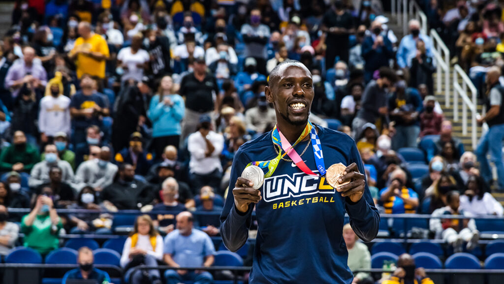 After a year with no spectators allowed because of the global coronavirus pandemic, a big, boisterous crowd of 6,948 turned out for the game, including Olympian Paul Chelimo ’14 and student trio 1aChord who sang the national anthem and performed at halftime.